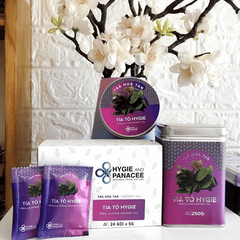Trà hoà tan Tía Tô Hygie được chiết xuất từ Lá Tía Tô tươi,Gừng tươi, chế biến thành dạng bột cô